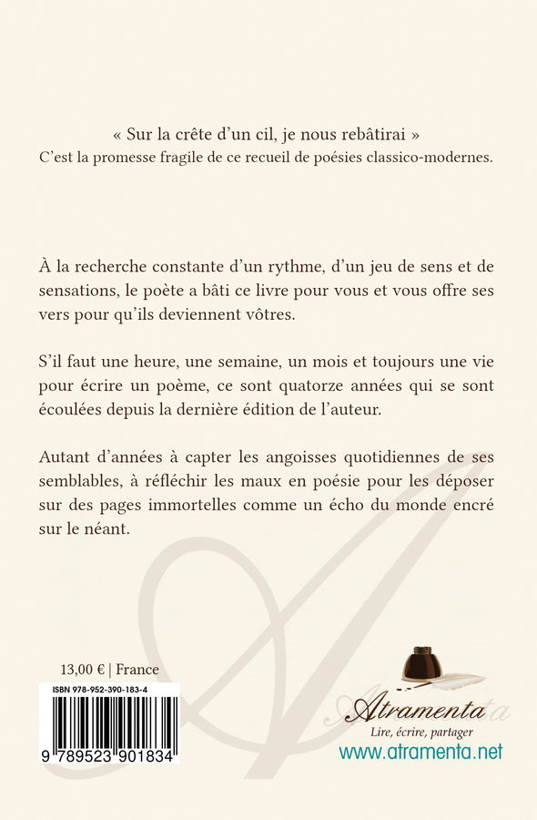 S’il faut une heure, une semaine, un mois et toujours une vie pour écrire un poème, ce sont quatorze années qui se sont écoulées depuis la dernière édition de l’auteur.