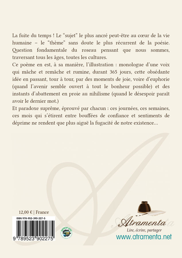 Ce poème en est, à sa manière, l’illustration : monologue d’une voix qui mâche et remâche et rumine, durant 365 jours, cette obsédante idée en passant, tour à tour, par des moments de joie, voire d’euphorie (quand l’avenir semble ouvert à tout le bonheur possible) et des instants d’abattement en proie au nihilisme (quand le désespoir paraît avoir le dernier mot.)