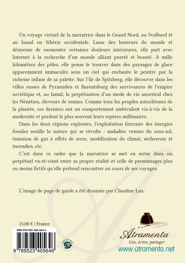 Un voyage virtuel de la narratrice dans le Grand Nord, au Svalbard et au Iamal en Sibérie occidentale. Lasse des horreurs du monde et désireuse de surmonter certaines douleurs intérieures, elle part avec Internet à la recherche d’un monde alliant pureté et beauté. À mille kilomètres des pôles, elle pense le trouver dans des paysages de glace apparemment immaculés sous un ciel qui enchante le peintre par la richesse infinie de sa palette. Sur l’île de Spitzberg, elle découvre dans les villes russes de Pyramiden et Barentsburg des survivances de l’empire soviétique et, au Iamal, la perpétuation d’un mode de vie ancestral chez les Nénètses, éleveurs de rennes. Comme tous les peuples autochtones de la planète, ces derniers ont un comportement ambivalent vis-à-vis de la modernité et perdent le plus souvent leurs repères millénaires.