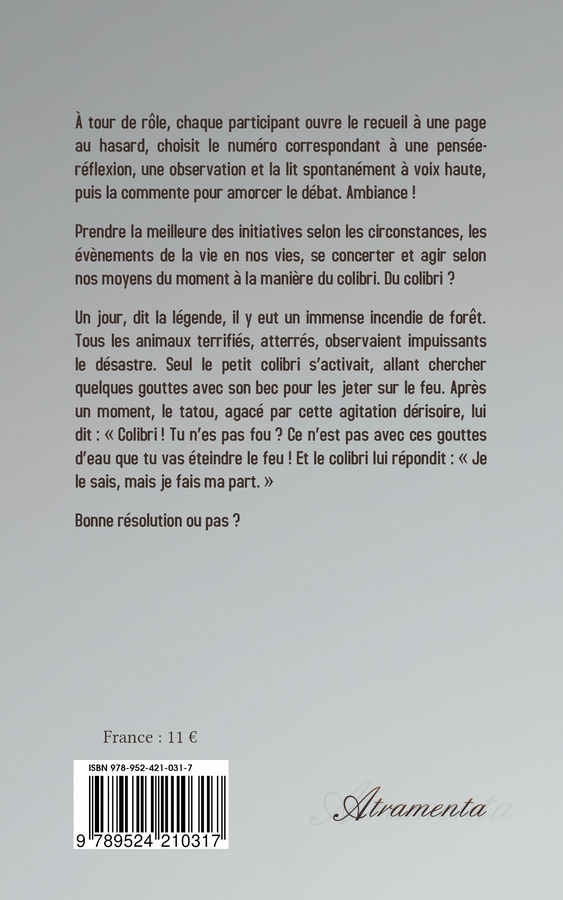 À tour de rôle, chaque participant ouvre le recueil à une page au hasard, choisit le numéro correspondant à une pensée-réflexion, une observation et la lit spontanément à voix haute, puis la commente pour amorcer le débat. Ambiance !