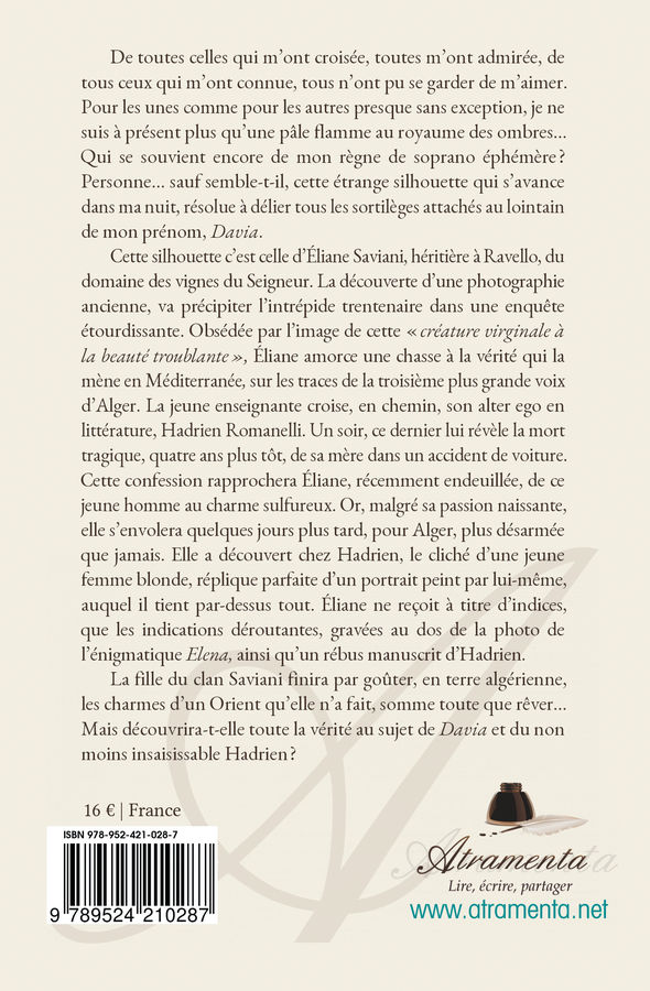 De toutes celles qui m’ont croisée, toutes m’ont admirée, de tous ceux qui m’ont connue, tous n’ont pu se garder de m’aimer. Pour les unes comme pour les autres presque sans exception, je ne suis à présent plus qu’une pâle flamme au royaume des ombres… Qui se souvient encore de mon règne de soprano éphémère ? Personne… sauf semble-t-il, cette étrange silhouette qui s’avance dans ma nuit, résolue à délier tous les sortilèges attachés au lointain de mon prénom, Davia.