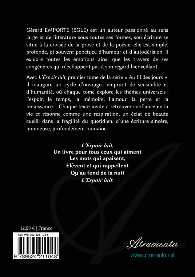 Avec L’Espoir luit, premier tome de la série « Au fil des jours », il inaugure un cycle d’ouvrages emprunt de sensibilité et d’humanité, où chaque tome explore les thèmes universels : l’espoir, le temps, la mémoire, l’amour, la perte et la renaissance… Chaque texte invite à retrouver confiance en la vie et résonne comme une respiration, un éclat de beauté cueilli dans la fragilité du quotidien, d’une écriture sincère, lumineuse, profondément humaine.