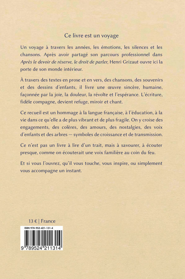 « Ma vie à cœur ou vers » est un voyage intime, poétique et musical à travers les saisons d’une vie. Henri Grizaut, ancien instituteur, chef d’établissement , et passionné de mots, nous livre ici un recueil de textes écrits au fil des années, inspirés par ses expériences, ses rencontres, ses colères, ses amours et ses rêves.