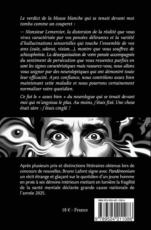 Après plusieurs prix et distinctions littéraires obtenus lors de concours de nouvelles, Bruno Lafont signe avec « Pandémonium » un récit étrange et glaçant sur le quotidien d'un jeune homme en proie à ses démons intérieurs mettant en lumière la fragilité de la santé mentale déclarée grande cause nationale de l'année 2025.