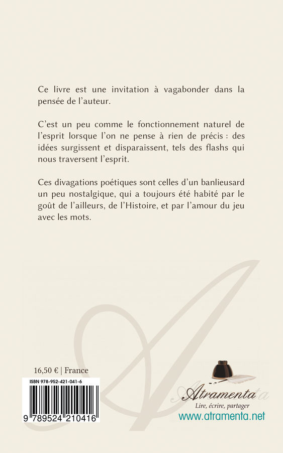 Ce livre de poèmes se veut un voyage aléatoire dans mes rêveries. Les idées en sont venues comme elles viennent... C'est ainsi que vous passerez d'un voyage à un grand personnage ou d'un plat à un animal. Allez, comme moi laissez vos idées vagabonder.... Tous le monde y trouvera quelque chose j'en suis sur tellement le voyage se fait aléatoirement...