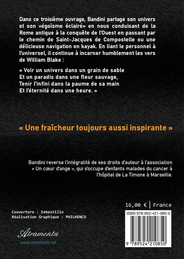 Entre carnet de voyage et développement personnel, cet ouvrage de Bandini nous pousse à nouveau à être la meilleure version possible de nous mêmes. Plus curieux, plus forts, plus ouverts... En partageant ses aventures, ses réflexions ou ses lectures il laisse transparaître sa philosophie de "l'égoïsme éclairé". Il ne s'agit pas d'une recette miracle, simplement une incitation à arpenter notre propre chemin en prenant conscience de ce qui nous entoure comme de notre potentiel. Partir du personnel pour arriver à l'universel, telle est sa devise.